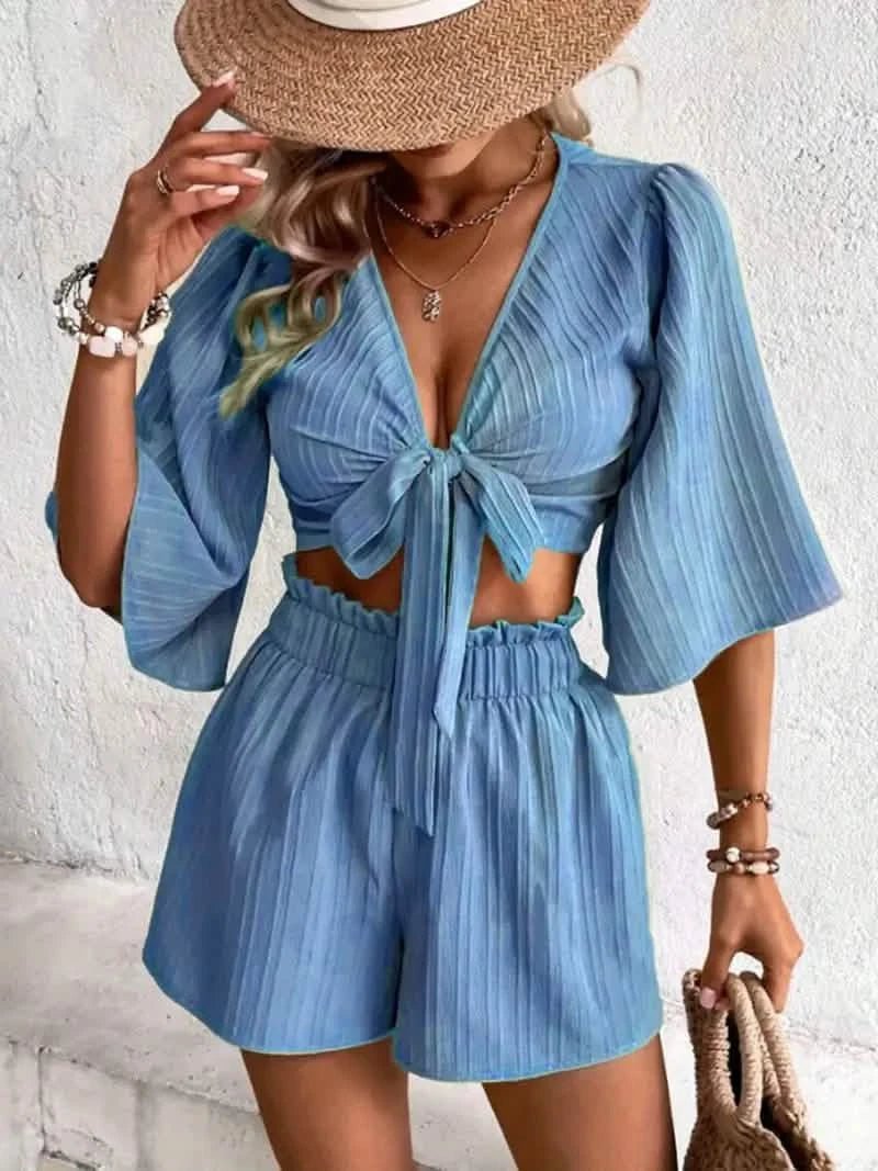 Stap stijlvol de zomer in met onze exclusieve Azure Elegance Co-ord Set. Deze luchtige tweedelige outfit, vervaardigd uit luxe geplooide stof met een subtiele glans, straalt moeiteloze elegantie uit. De top met diepe V-hals en charmante strikdetail benadrukt je silhouet op verfijnde wijze, terwijl de bijpassende high-waisted short met elastische taille een flatterende pasvorm garandeert. Perfect voor een strandwandeling, een zonnige lunch of een stijlvolle getaway. Combineer met een rieten tas en hoed voor de ultieme resort look.