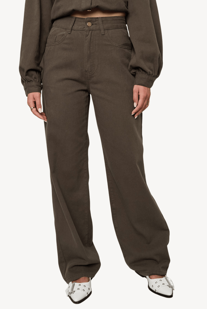 Deze high-waist broek in stevig twill geeft elke look een nonchalante, moderne vibe. De rechte, wide-leg pijpen vallen mooi langs het been en verlengen optisch, terwijl de middelhoge tot hoge taille je silhouet flatteert. Minimalistisch design met steekzakken en een klassieke rits- en knoopsluiting—makkelijk te stylen van casual tot smart.